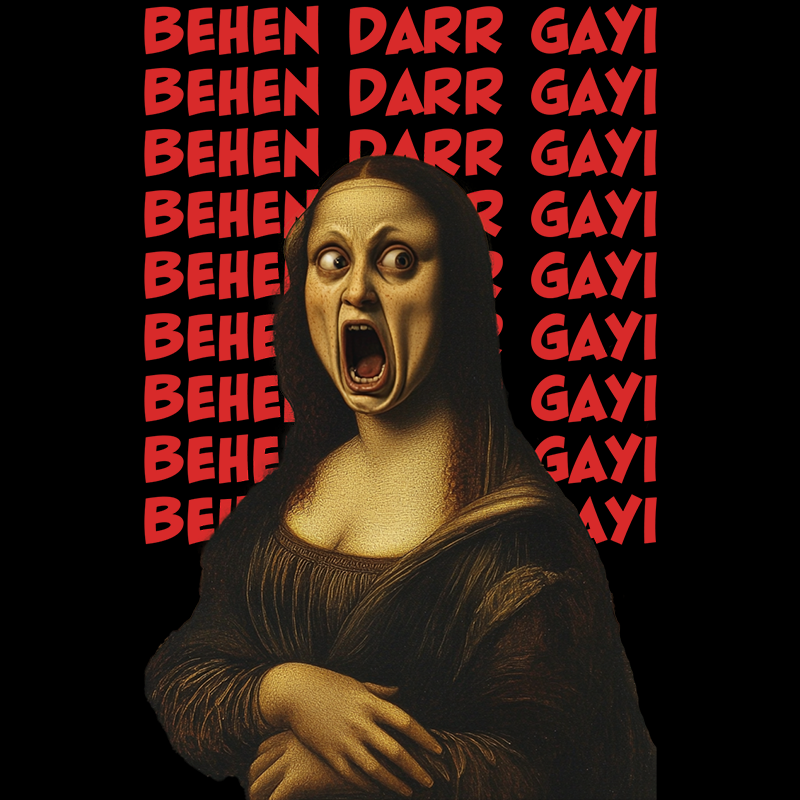 This tee reimagines Mona Lisa having a full panic attack — mid-scream — as Akshay Kumar yells “Behen darr gayi!” in the background like it’s Bhagam Bhag 2.0.