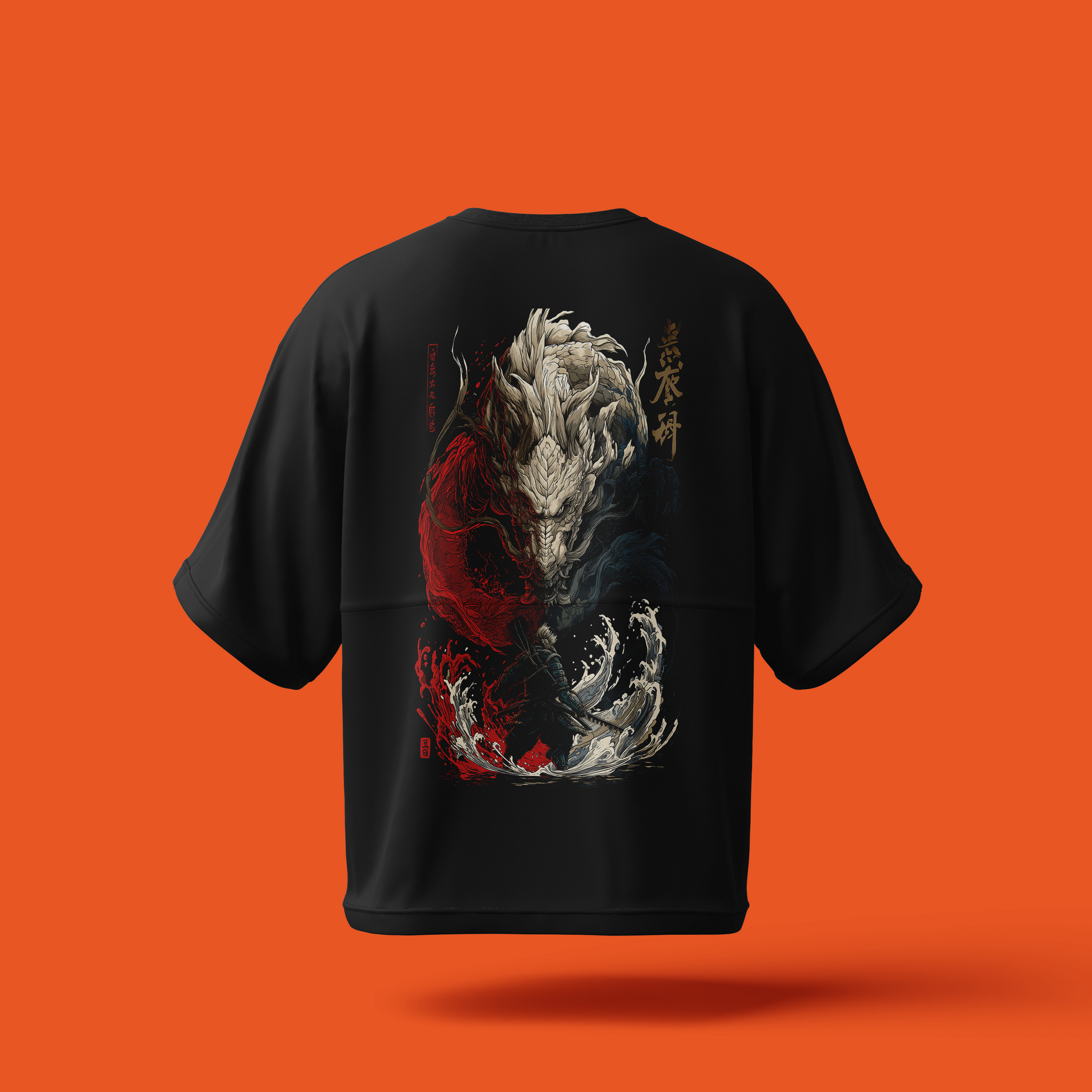 This design brings to life a mythical duel between a lone samurai and a colossal dragon spirit, swirling in waves of red and blue energy. It’s not just a battle — it’s a balance of power, chaos, and fate.