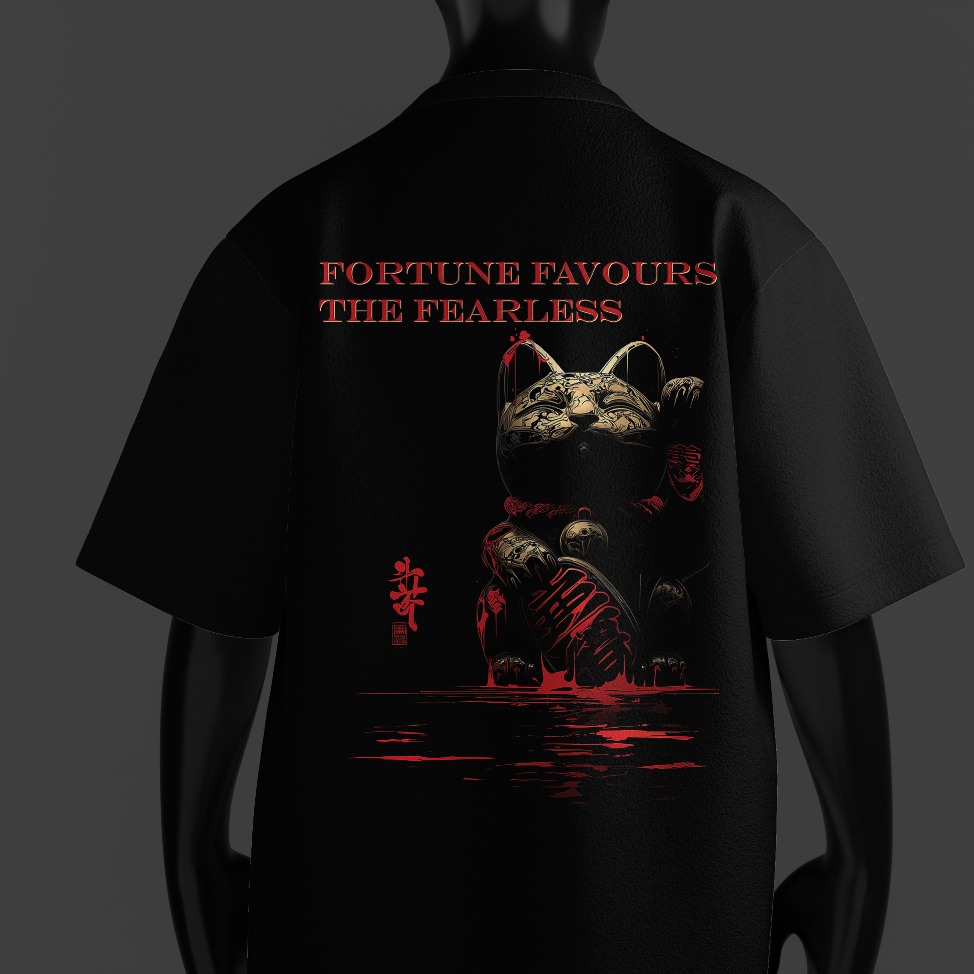 This limited-edition tee features our AI-reimagined Maneki-neko (Lucky Cat) with a dark twist — tattooed in ancient symbolism, rising from crimson tides, and backed by a mantra for the bold: Fortune Favors the Fearless.